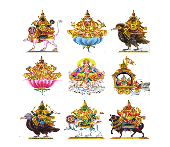 Navagrahas are the nine cosmic objects that are said to have a great effect on the human lives. The Navagrahas include Surya, Chandra, Mangal, Buddha, Brihaspati, Shukra, Shani, Rahu and Ketu. While the Sun is a star, Mangal, Budha, Brihaspati, Shukra and Shani are planets of the solar system. Chandra is the moon and Rahu and Ketu are the north and south nodes of the moon.Flowers, lighting a lamp, cloth are the regular offerings